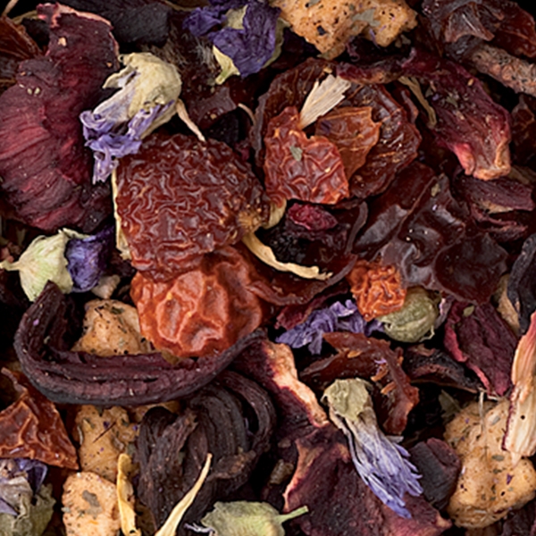 - ترکیبات: هیبیسکوس، رز هیپ ۳۰٪، سیب، بلوبری ۲.۵٪، توت سیاه ۲.۵٪، گلبرگهای گل همیشهبهار، گلبرگهای گل گندم آروما: توت وحشی در ابتدا، ترشی هیبیسکوس در پسزمینه. رنگ: قرمز درخشان طعم: قوی، غلیظ، میوهای. مناسب به همراه کیک ها و تارت میوهای.